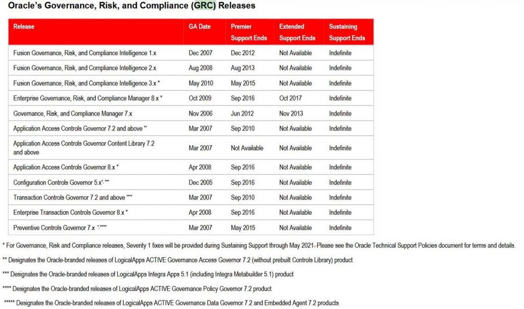 Products such as Application Access Controls Governor (AACG), Configuration Controls Governor (CCG), Preventive Controls Governor (PCG) and Transaction Controls Governor (TCG) are under the indefinite “Sustaining Support” “Governance, Risk and Compliance Severity 1 fixes will be provided during Sustaining Support through *May 2021.” Oracle states “Please see the Oracle Technical Support Policies document for terms and details.”