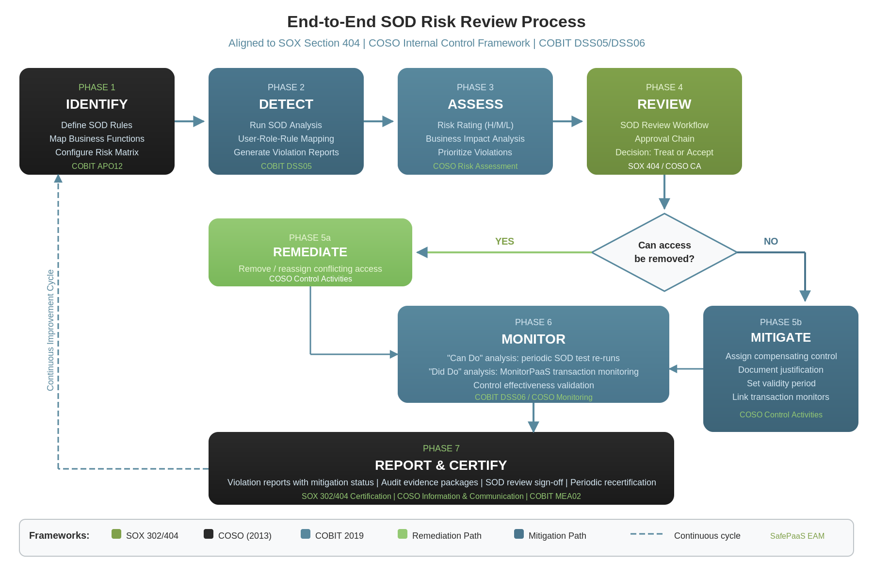 Treatment is not a one-time event. Remediated violations need verification that access changes took effect. Mitigated violations need continuous monitoring — both periodic SoD re-testing (“can do” analysis) and transaction-level monitoring through MonitorPaaS (“did do” analysis). This maps to COSO’s Monitoring Activities and COBIT’s DSS06 process controls.