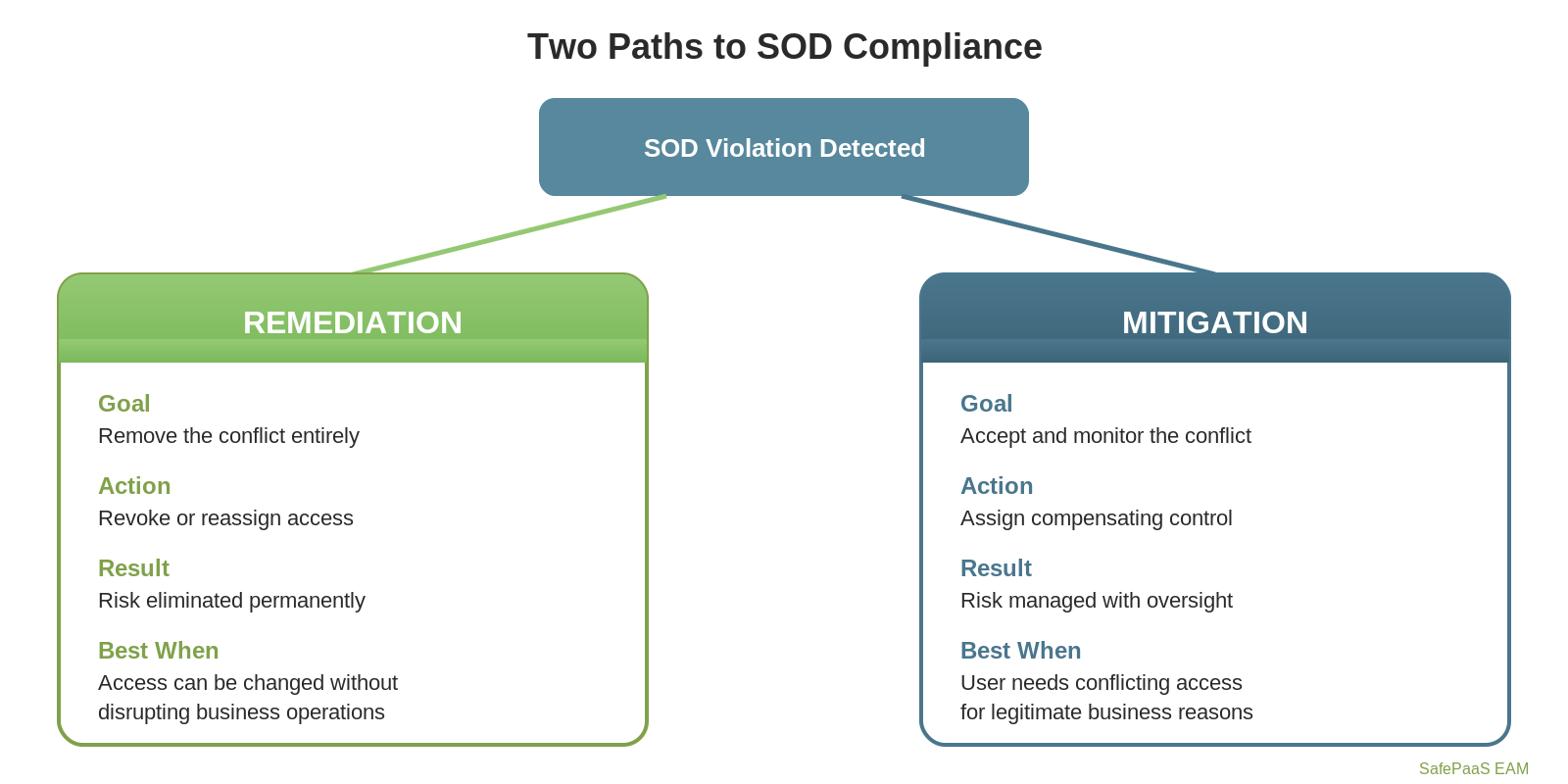 Segregation of Duties compliance isn’t binary. The real world demands a spectrum of risk treatment options. Remediation handles the violations you can fix. Mitigation controls handle the ones you can’t — with structure, accountability, and continuous monitoring.